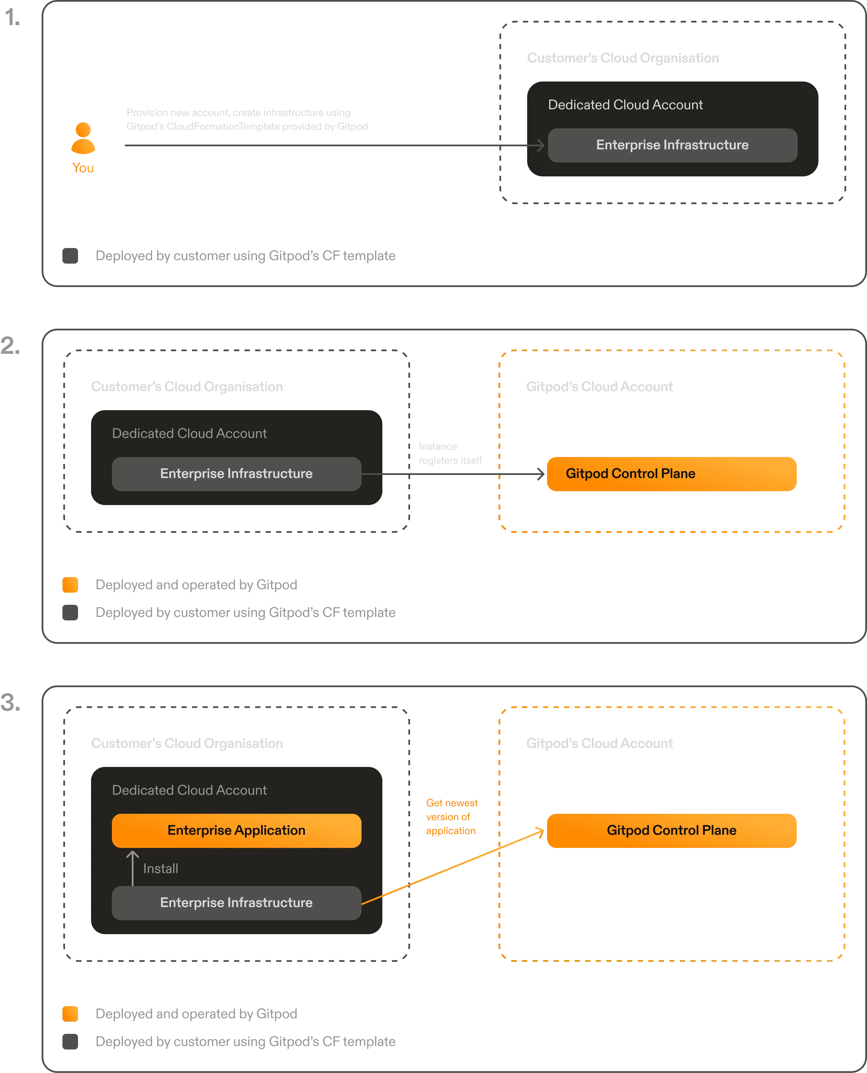 Once the CloudFormation template successfully executes, the instance will register itself with the Gitpod Control Plane. Registration happens via an outgoing connection only that uses AWS PrivateLink - the Control Plane has no ingoing connection to the instance. See Networking and Data Flows.