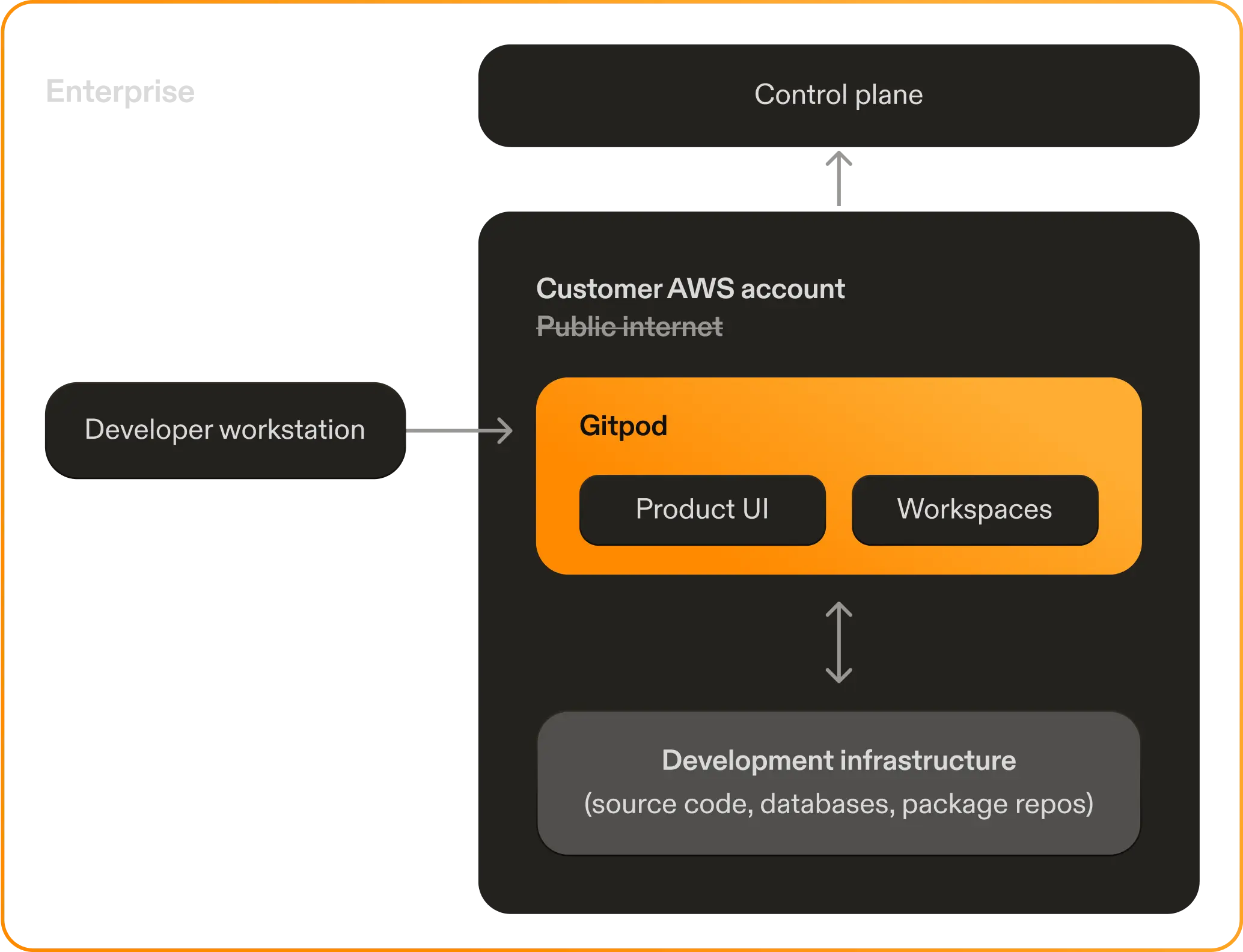 Data Isolation | Application layer isolation. Data secured by Gitpod. | Infrastructure layer isolation. Data secured in your cloud account and network. |
