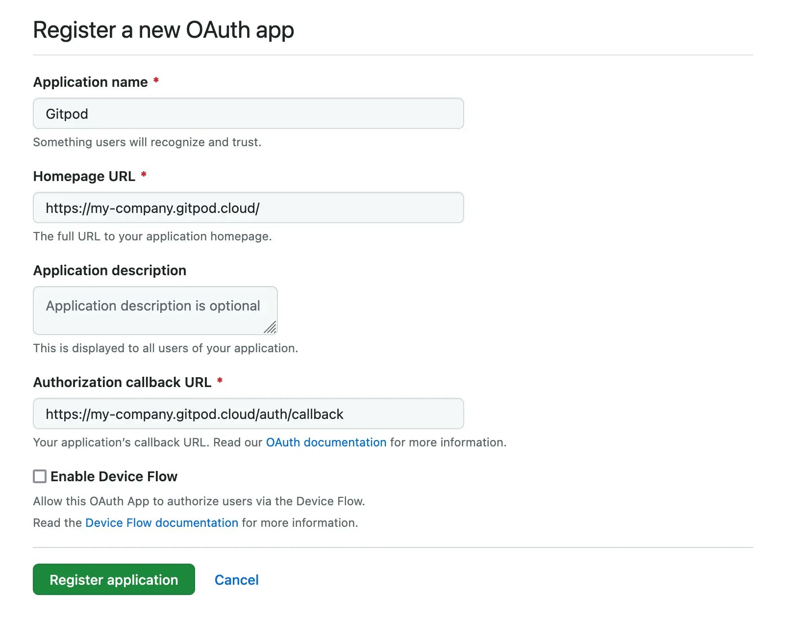 (or any other name you prefer) - Homepage URL: your Gitpod instance URL