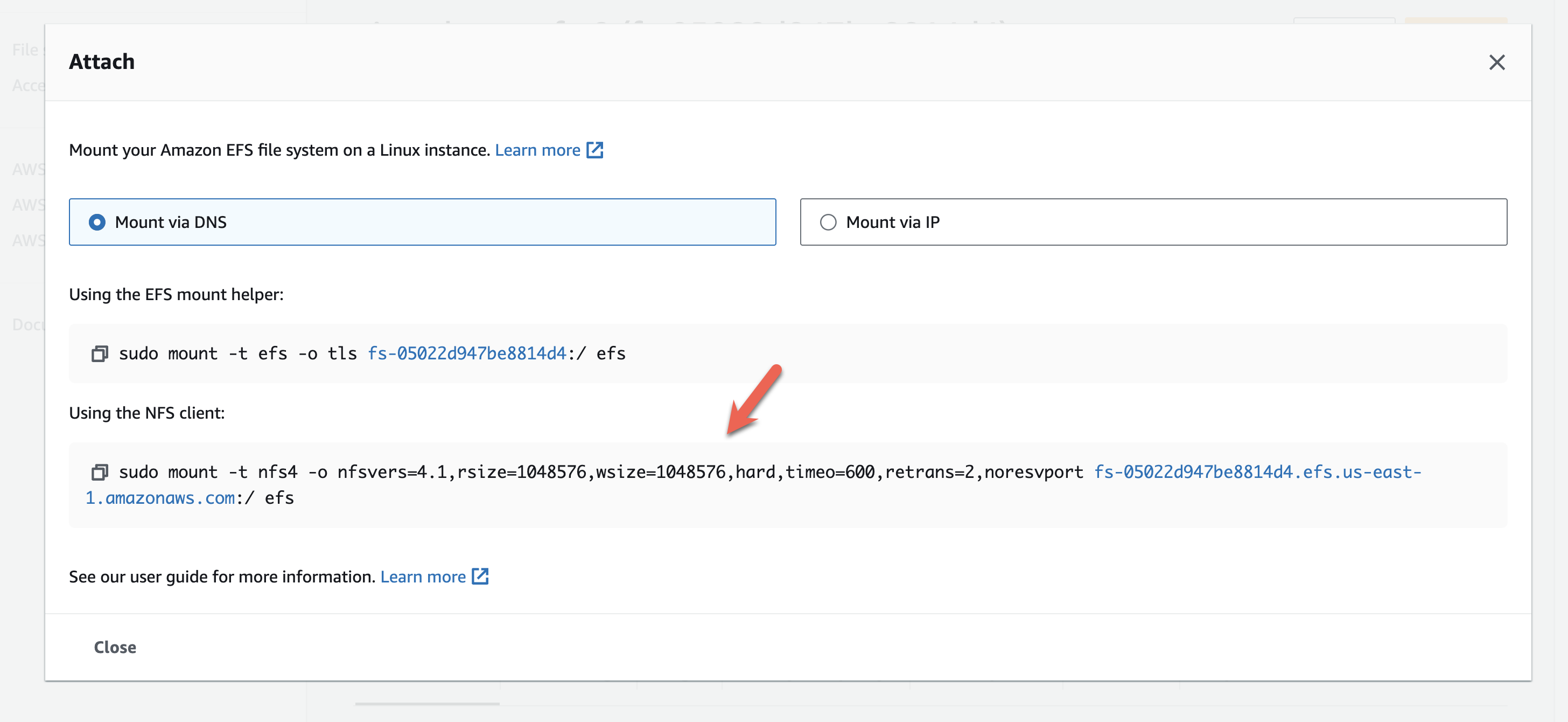 • Click the Attach button on the overview page of your EFS file system, copy the command for the NFS client.