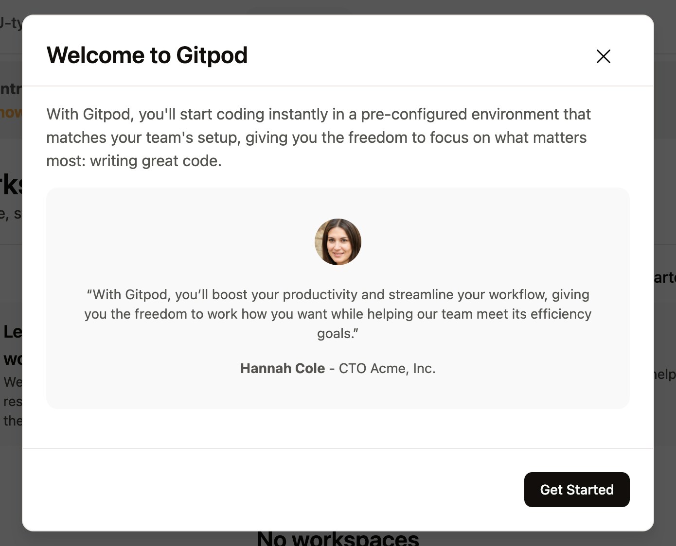 You can set a welcome message for new members of your organization. This message will be displayed when a new member signs in to the Gitpod dashboard for the first time. The welcome message contains the following sections:- User avatar - avatar of a member from your organization of your choice. Can be used to attribute a “face” to the message.
