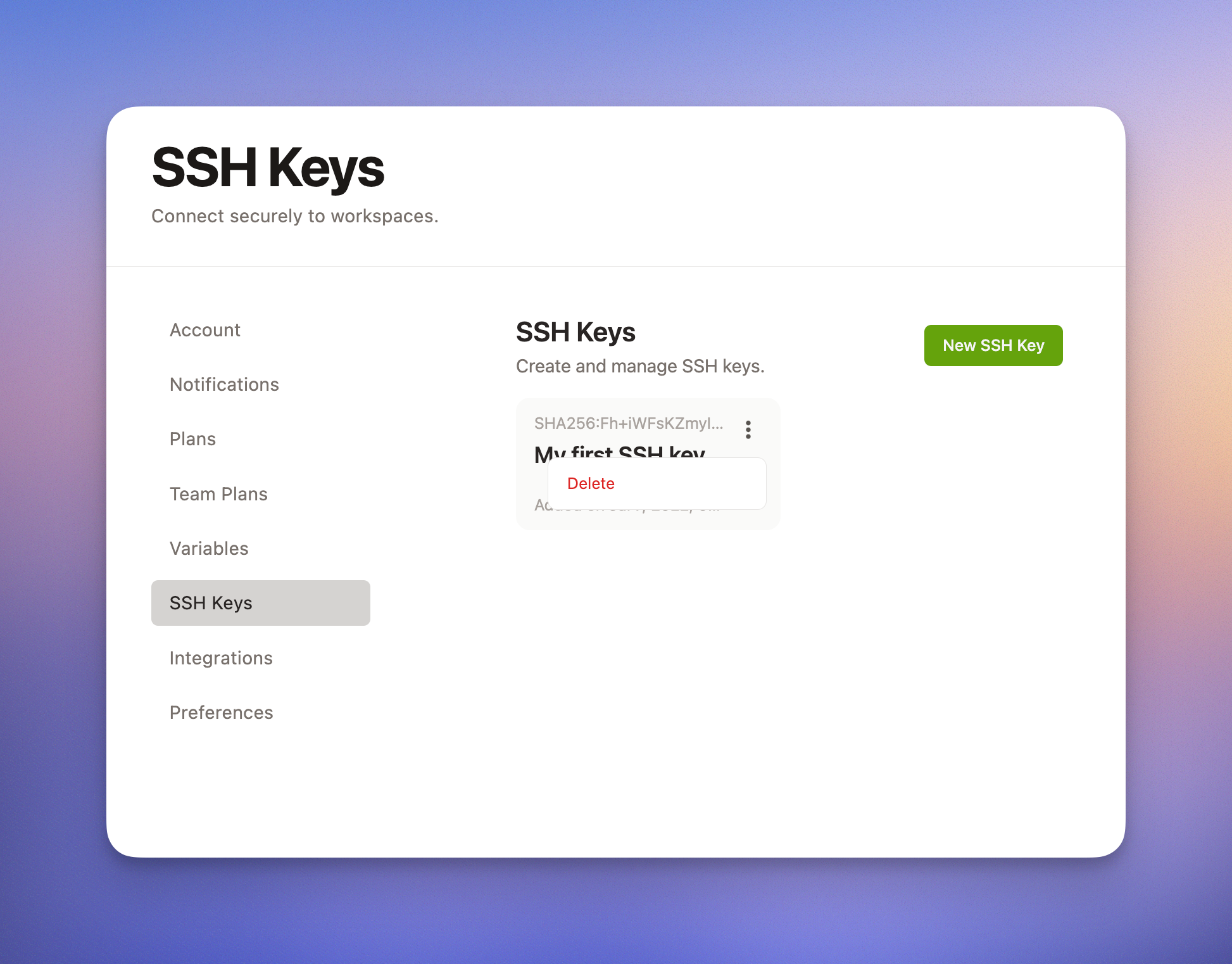 To delete an SSH key, click the kebab menu to the right of the SSH key in the dashboard and select “delete”.