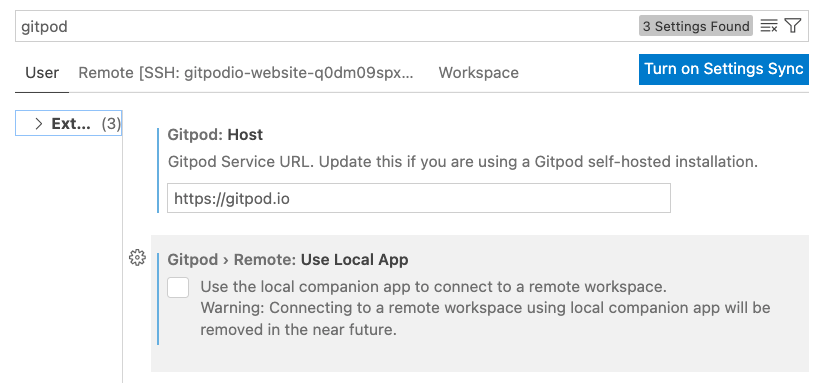 The VS Code Desktop Gitpod extension useLocalApp setting