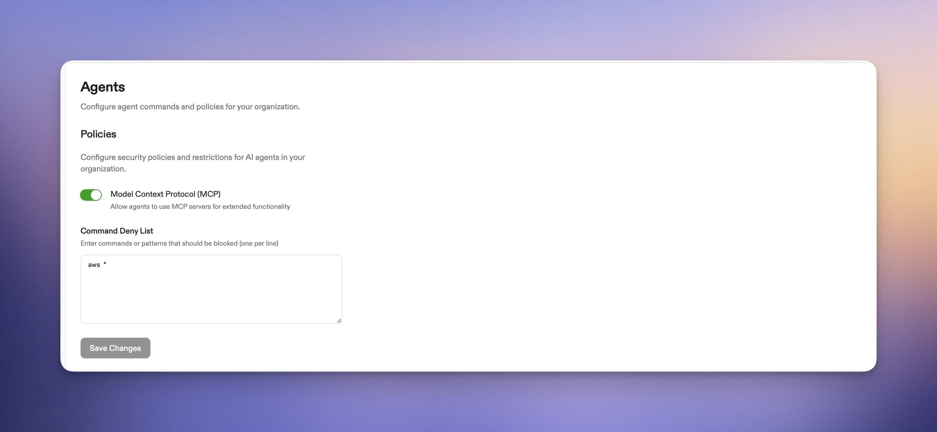 - Add command patterns to the “Command Deny List” field, one per line