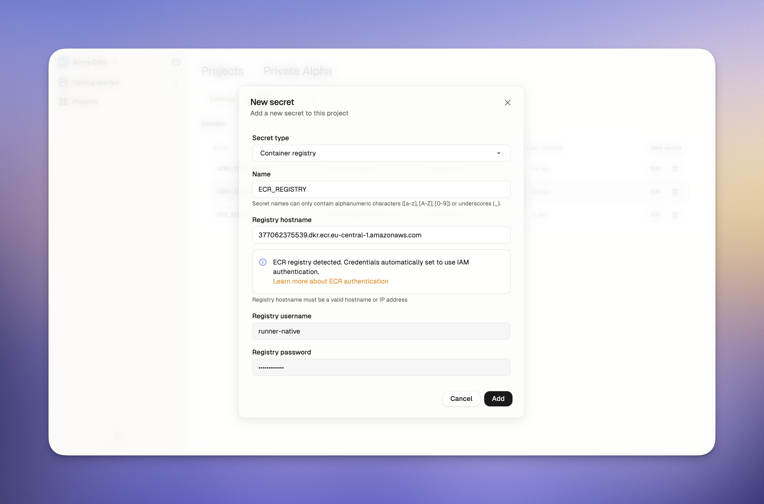 - When you enter an ECR registry hostname, the username and password fields will automatically be filled with runner-native to indicate that native runner authentication will be used