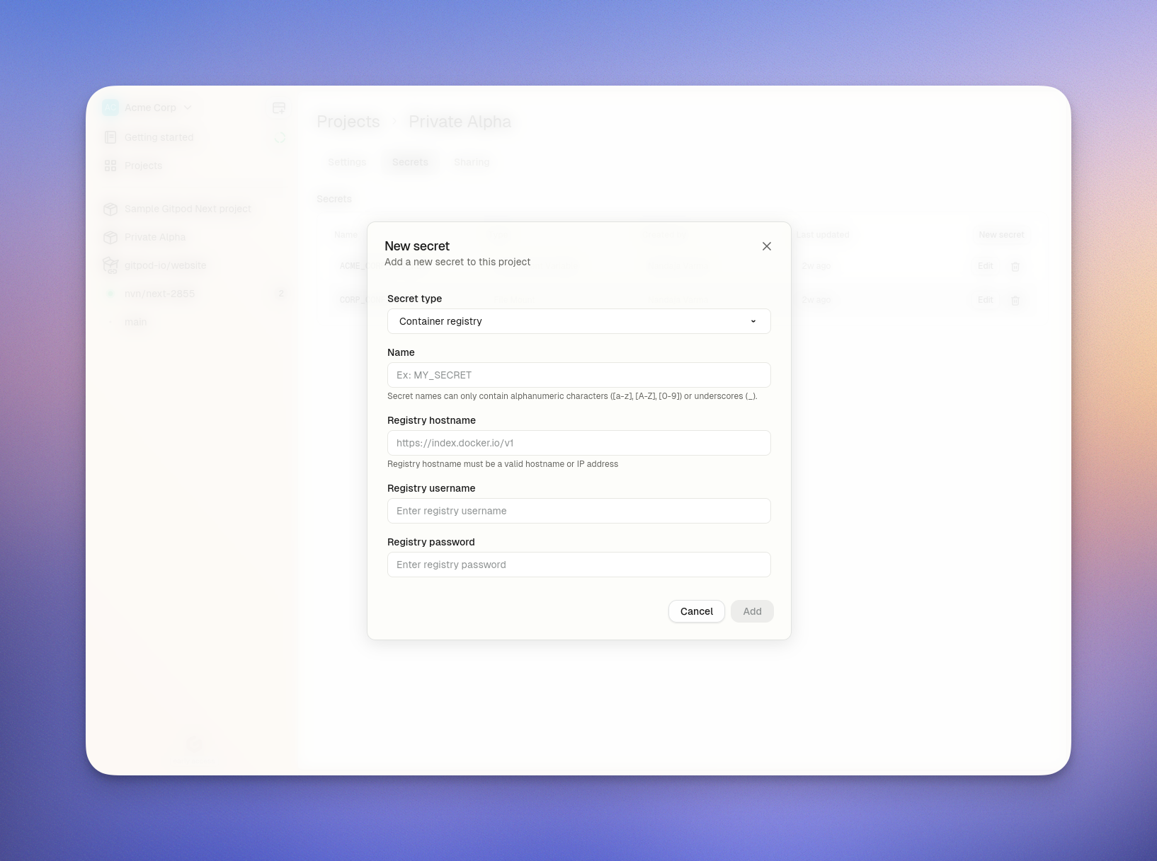 Once created, container registry secrets serve two purposes:- They authenticate with private registries to pull images for your Dev Container during environment creation.