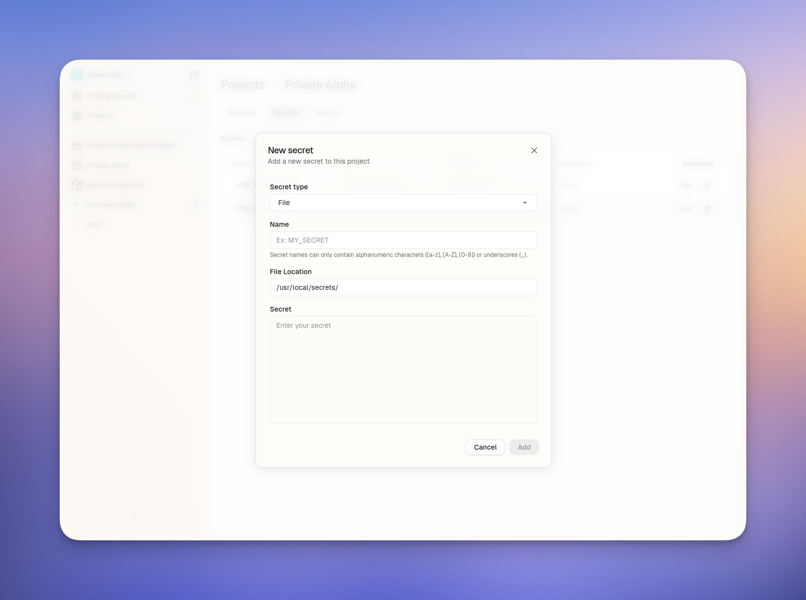 - Type of secret: “File” (cannot be changed after creation)