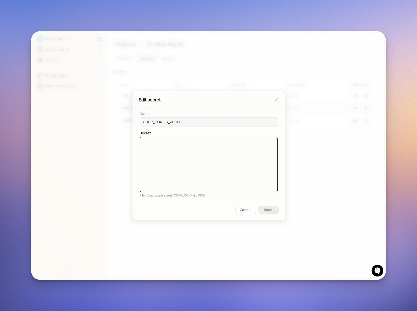 You can update the content of a file secret at any time, although the mount path cannot be changed once the secret is created.- Navigate to the Project > Secrets page in your Ona dashboard