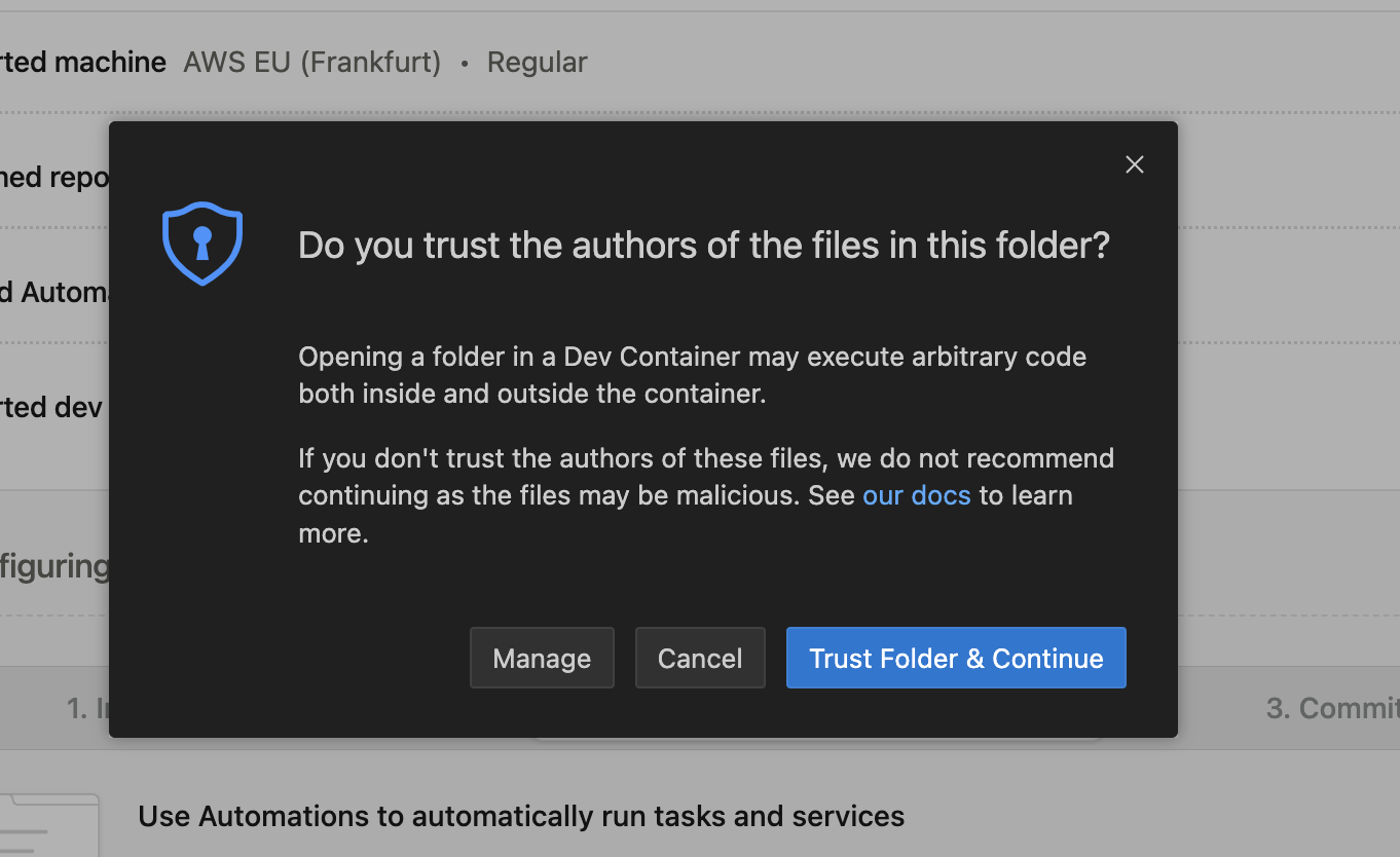 When connecting to a new environment, VS Code may prompt you to trust the workspace. This is a standard security measure for potentially untrusted code. For more information, refer to the VS Code documentation. Ona environments always run in isolated VMs, ensuring that code doesn’t access secrets outside the environment. The environment remains secure regardless of how you access it. If you’re familiar with the repository, you can safely click Trust Folder & Continue.