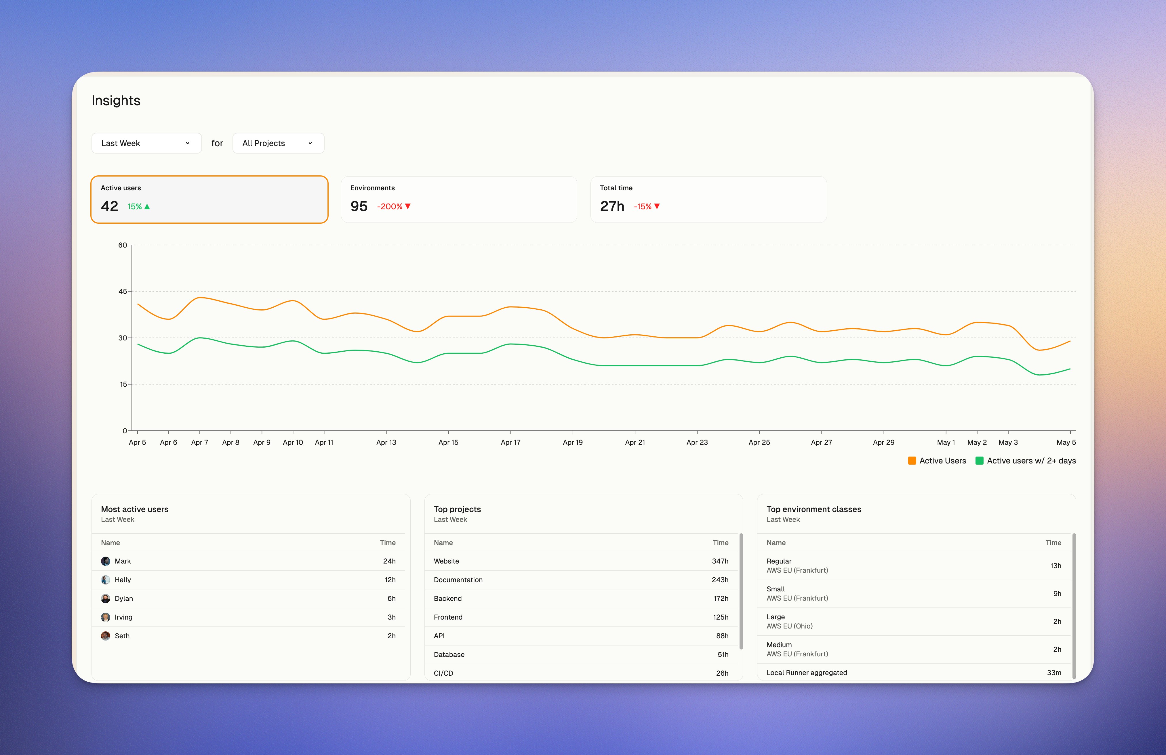 Insights provide organization administrators with powerful analytics to track environment usage across their organization. This feature helps identify usage patterns, optimize cloud infrastructure costs, and monitor adoption across teams.