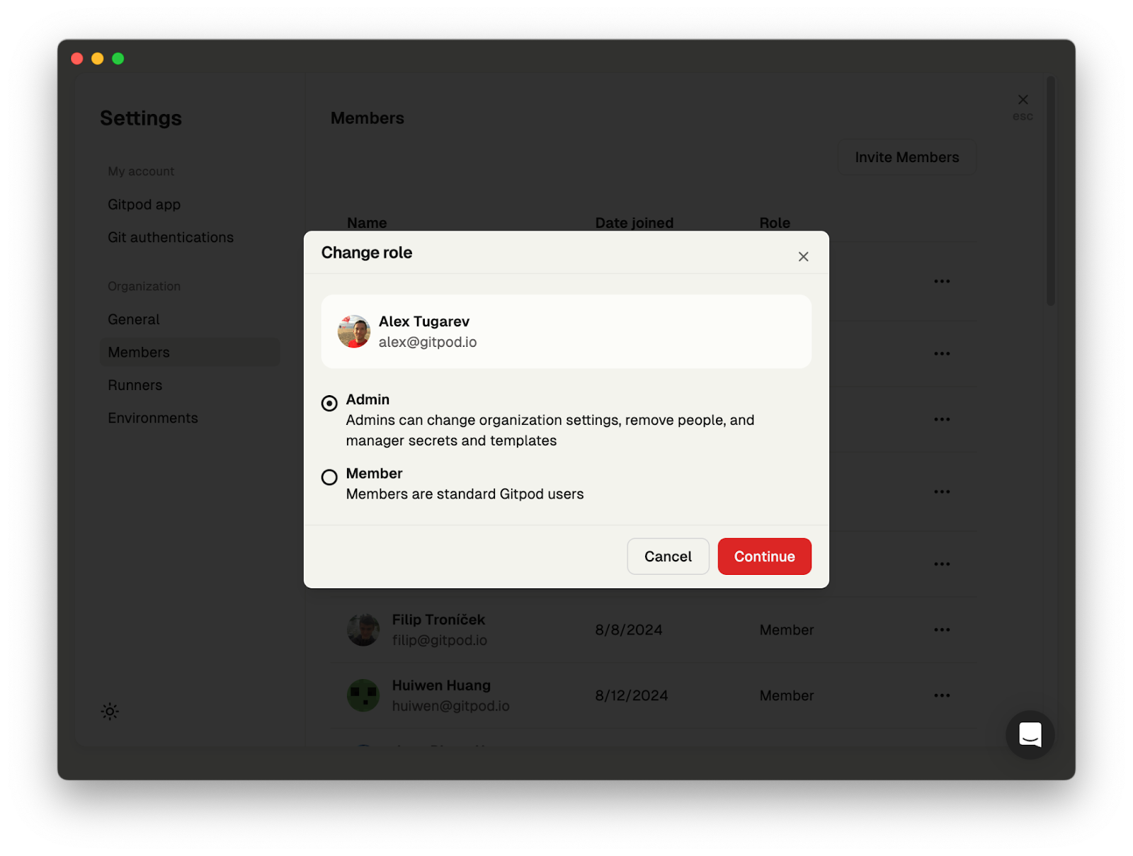 Members of an organization can have of the following roles:- Admin - an admin is a privilidged member who can manage other members, create remote Runners, view all resources and administer the organization.