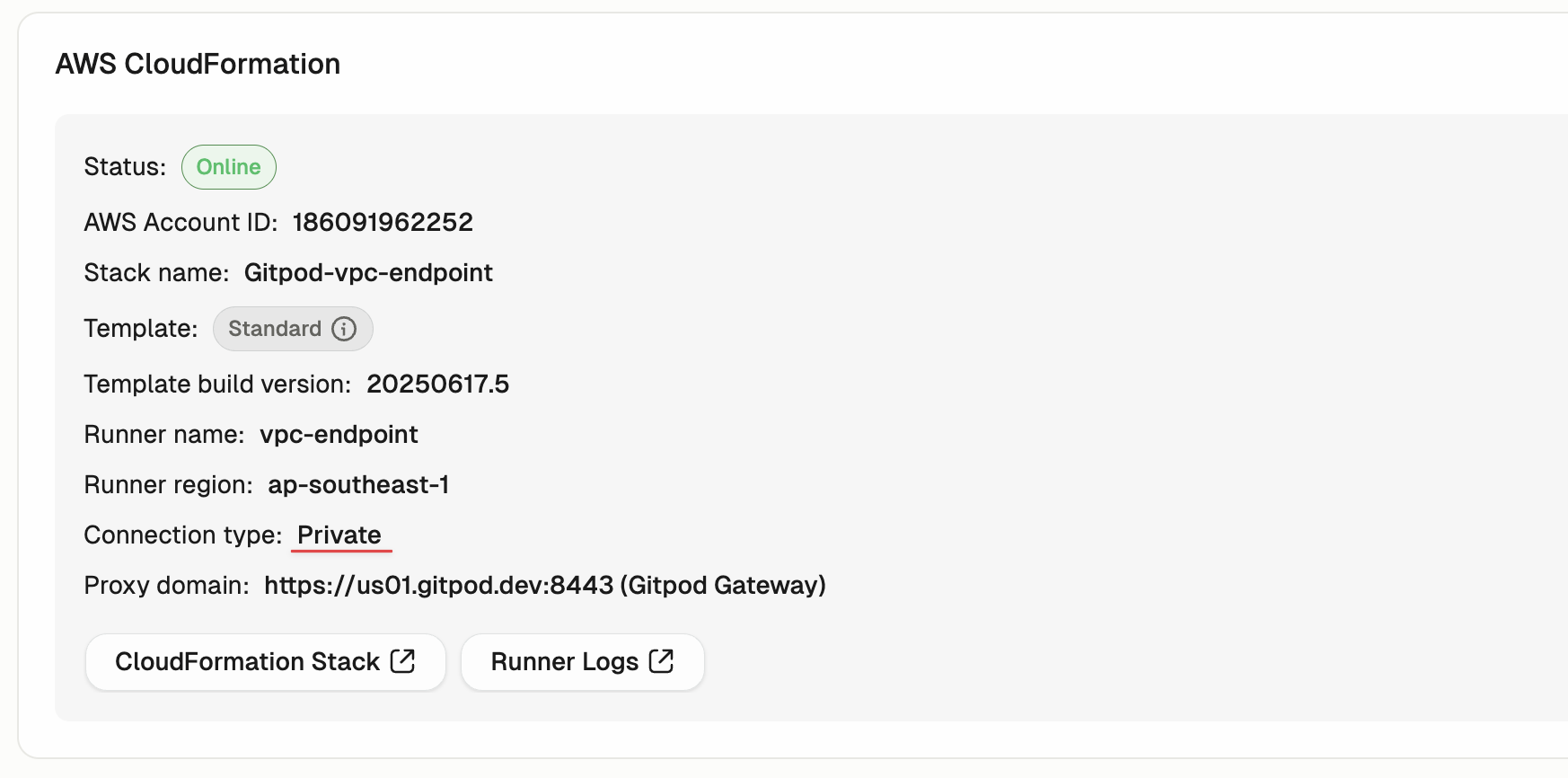 Next, ensure you are signed into the right AWS account in the AWS console, and then press Open AWS CloudFormation to start deploying the Runner into your AWS account. This will link you to the AWS console to create the CloudFormation stack: