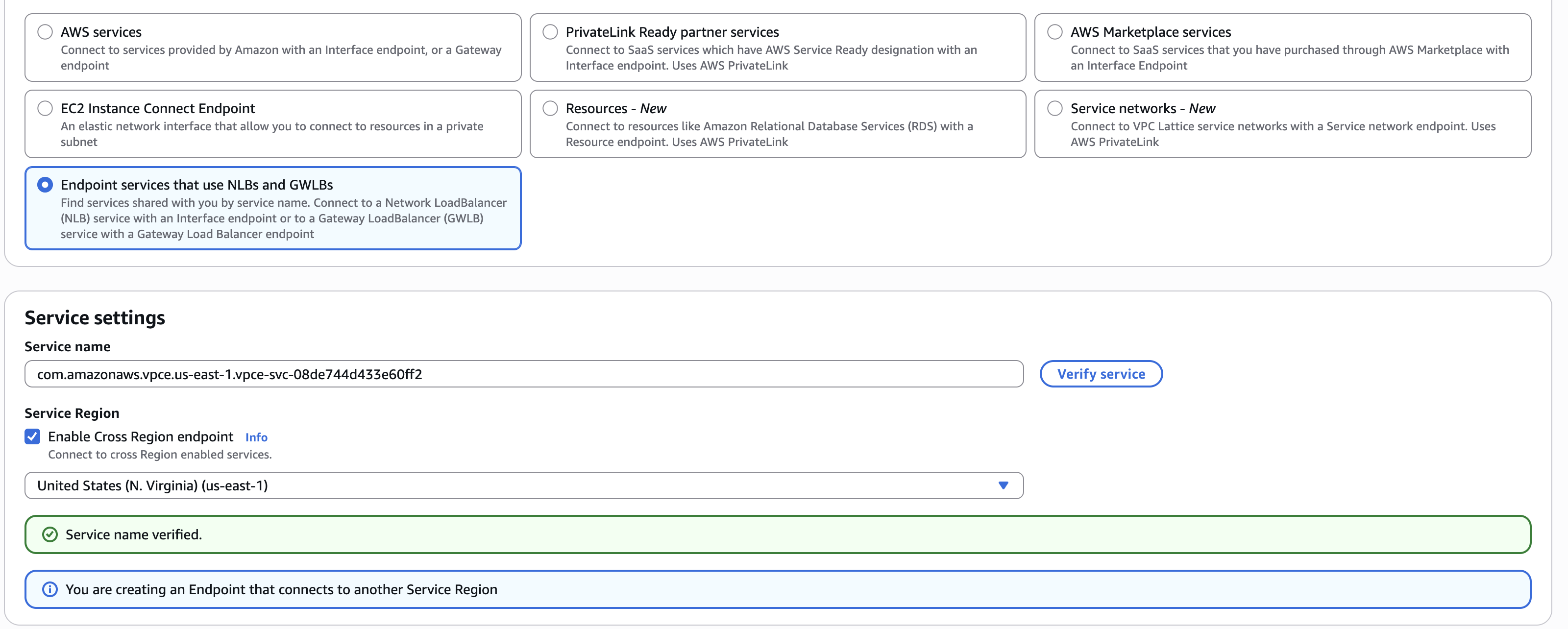 - Service type: Select “Endpoint services that use NLBs and GWLBs”
